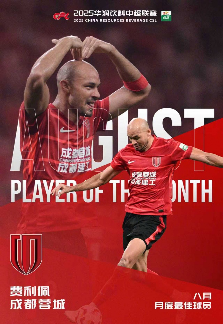 9月25日讯 中超职业联赛 官方消息,成都蓉城外援费利佩当选8月职业联赛 最佳球员。
