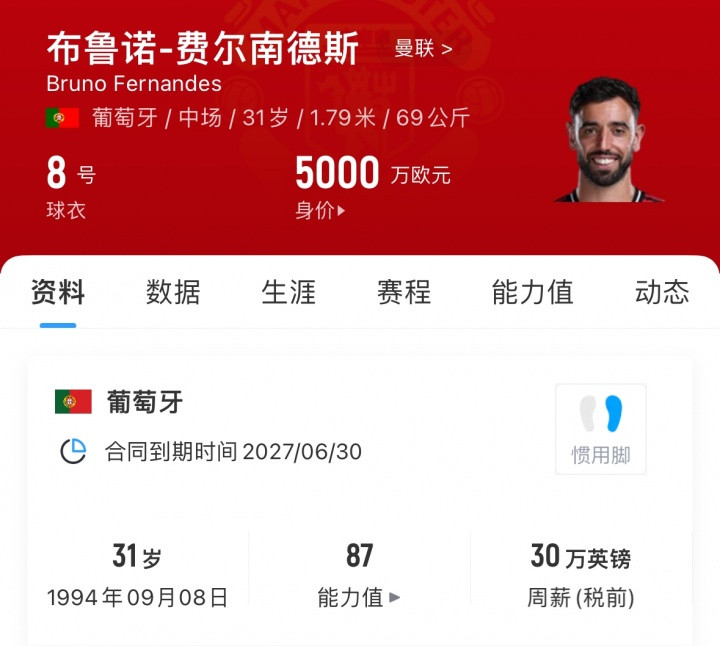 B费现年31岁,他与曼联的合同到2027年到期,他现身价5000万欧,他在曼联的周薪为30万镑。据罗马诺报道,欧洲杯直播今夏,曾有沙特球队1亿镑报价B费,并提供三倍薪水的合同,但B费选择留队。