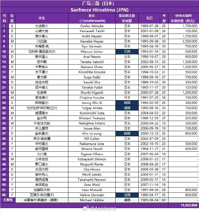 2025-26赛季亚冠精英职业联赛 (职业联赛 阶段)日本广岛三箭球员名单