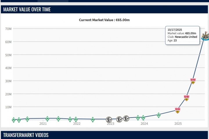 沃尔特马德今夏从斯图加特转会至纽卡,转会费7500万欧。本赛季他4场英超打入3球。