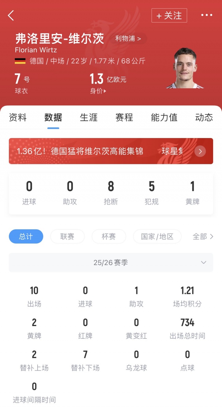 10月18日讯 德转昨日更新英超球员身价,今夏加盟利物浦的维尔茨身价下降1000万欧,从原来的1.4亿调整为1.3亿欧。