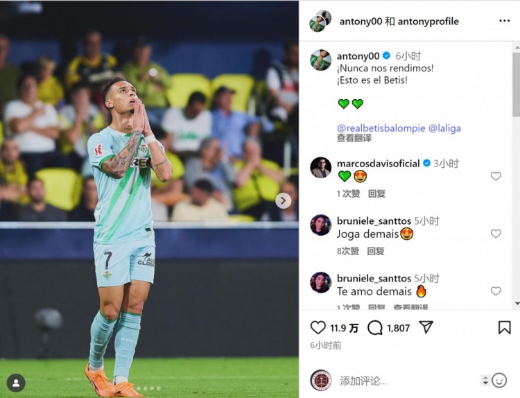 连进两球+补时绝平!安东尼社媒:我们永不言弃,这就是贝蒂斯