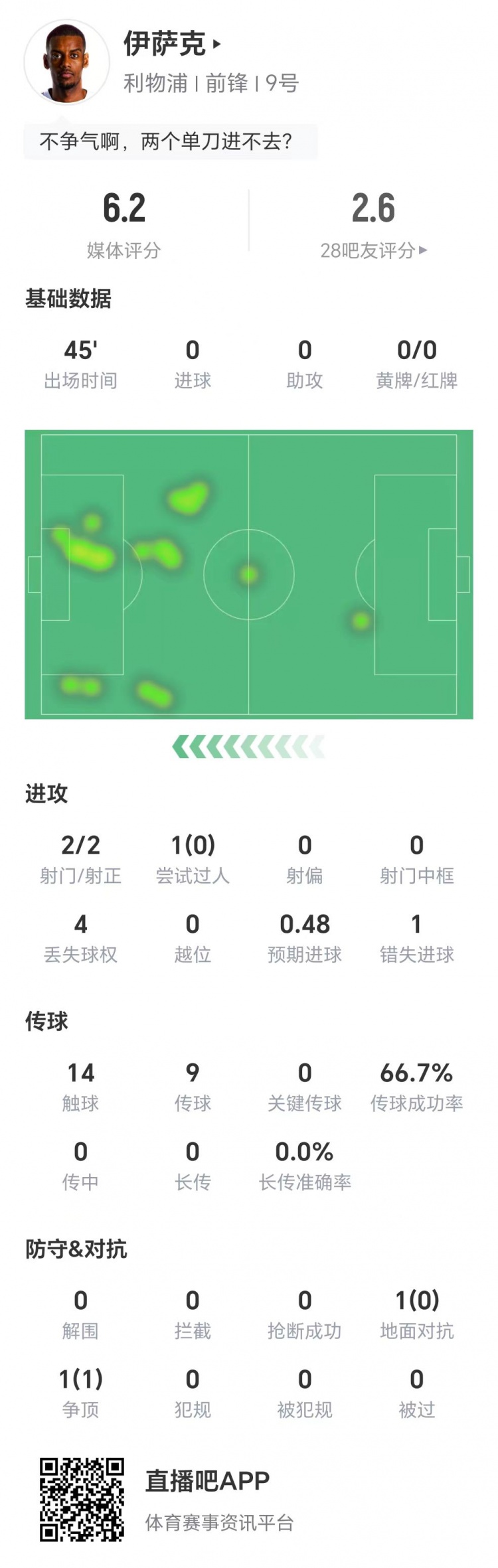 半场被换下,伊萨克本场数据:两射两正,1次错失得分 ,获评6.2分