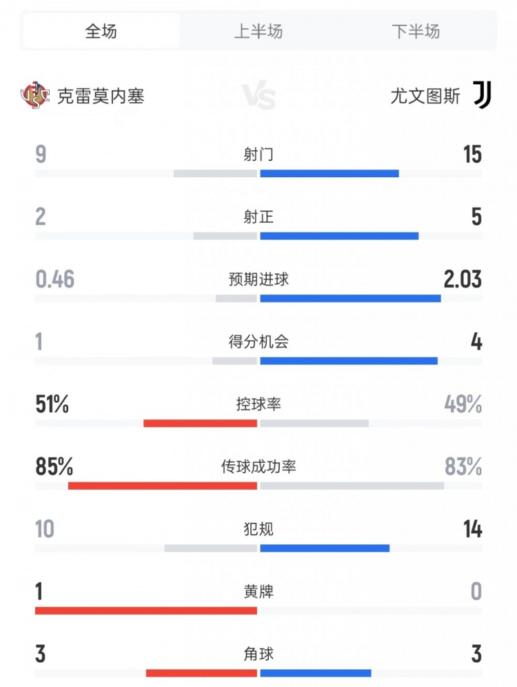 克雷莫内塞vs尤文全场数据: