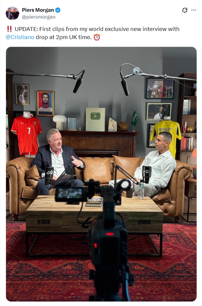11月03日讯 著名主持人皮尔斯摩根发文预热表示,C罗全球独家专访的首个片段将于北京时间今晚10点放出。