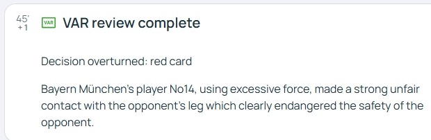 官方解释:“决定推翻:驱逐 。拜仁14号球员使用过度力量,与对方球员腿部发生明显不正当接触,严重危及对方球员安全。”