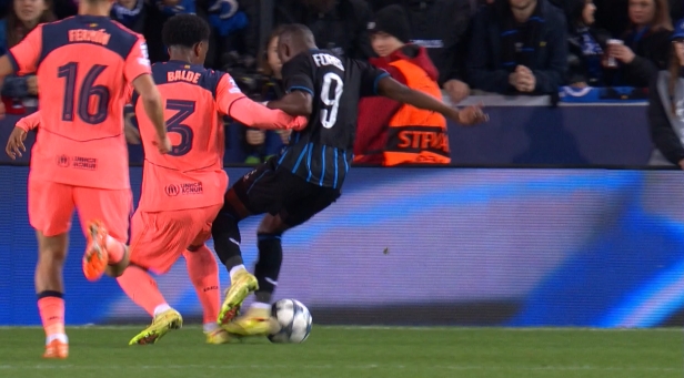 11月06日讯 欧冠第4轮布鲁日vs巴萨,第72分钟,博尔赫斯拿球杀入危险区域 ,欧洲杯直播吧在巴尔德防卫 下倒地,主裁判 泰特第一时间判决 十二码球,但随后亲自看过VAR后取消了十二码球的判决 !