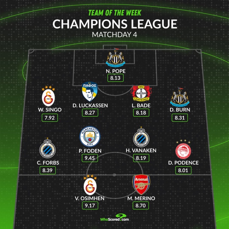 WhoScored本周欧冠最佳阵:奥斯梅恩、梅里诺、福登、丹-伯恩在列