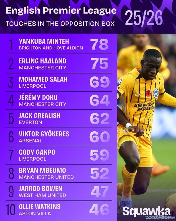11月11日讯 英超职业联赛 已经进行了11轮,squakwa也统计了本赛季英超在对方危险区域 内触球次数情况,欧洲杯直播明特力压哈兰德居首。