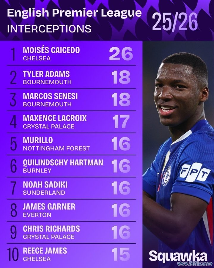 1.莫伊塞斯·凯塞多,切尔西,26次
